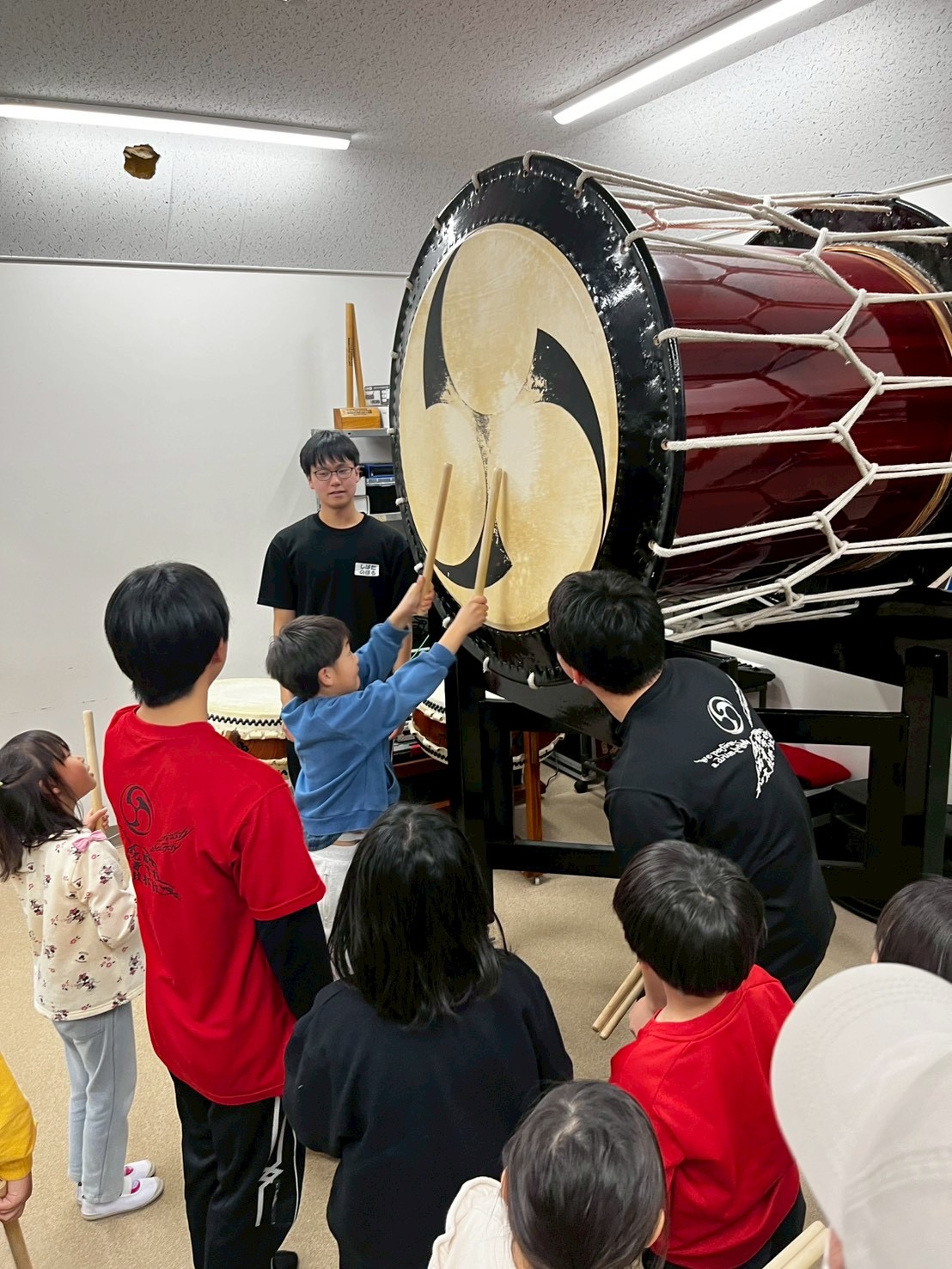 小学生と高校生が一緒になってリズムを覚え、最後は一曲みんなで叩けるまでになりました。