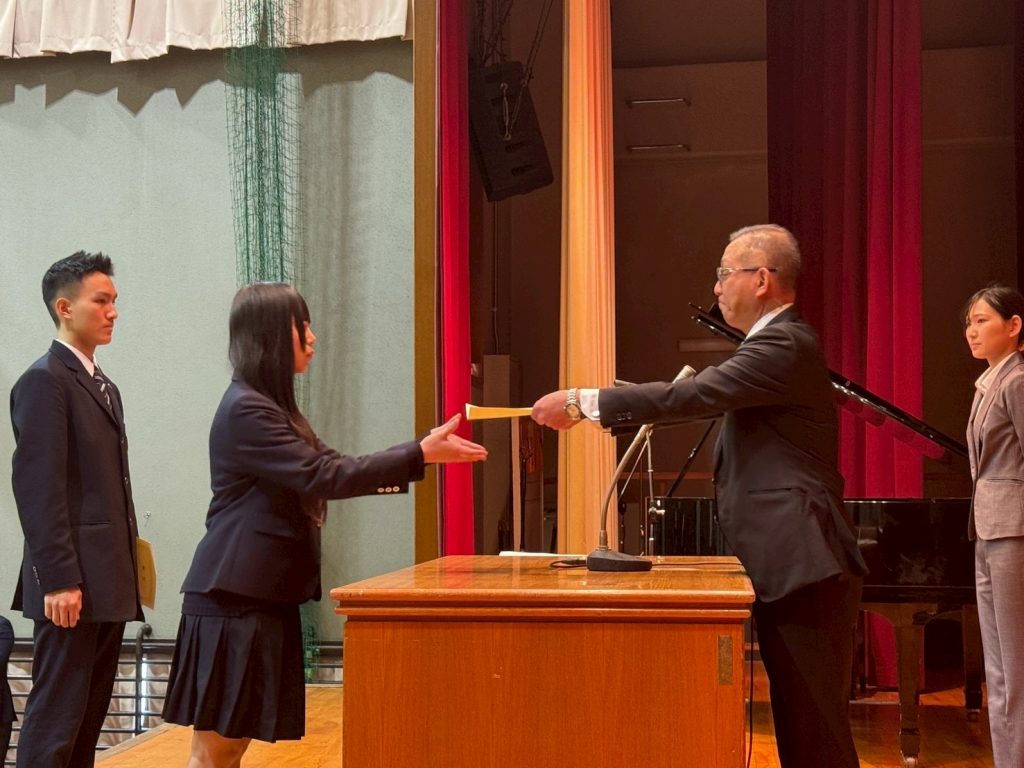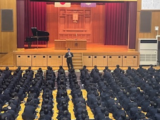3月18日(水)3学期終業式を実施しました。学校長の式辞後、成績優秀賞をはじめ各種検定試験合格など今学期に活躍をした生徒へ表彰が行われました。式典後、生徒会主催の壮行会では春休み中に全国大会へ出場する女子ソフトボール部を激励しました。全国大会での活躍を期待しています。最後に生徒部長から春休み中の諸注意がありました。新年度に向けて充実した期間となるようにしてください。本日をもって令和7年度の教育課程が無事に終了しました。 本日、教科書販売を行いましたが購入できていない人は、直接ヒバリヤ書店(布施駅前店)での購入をお願いします。次回登校日は4月8日(水)始業式です。