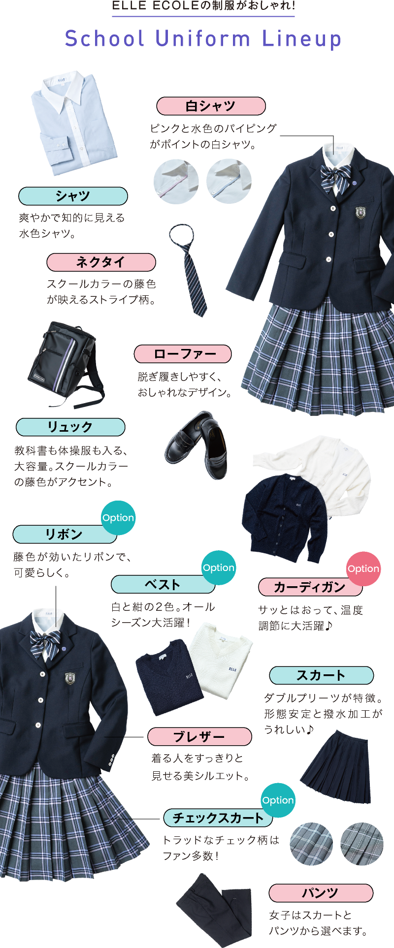 女子の制服は、清楚で上品なかわいらしさを表現したELLEブランド。またスカートやニットに数多くのオプションを用意しています。自分なりのコーディネイトで、かわいく着こなせるのも人気の理由!色使いにもこだわり、清楚な表情を持つ制服です。男子の制服も、着心地と素材をじっくり吟味したこだわりの逸品です。